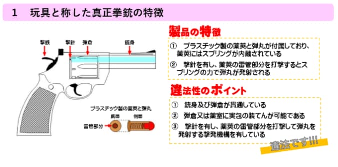 玩具と称する銃の違法のポイントは・・・銃身と弾倉が貫通していて、弾丸の装てんができること、弾丸の一部を叩くことができる「撃針」と呼ばれる場所があることだとしています。(参考画像:警察庁)