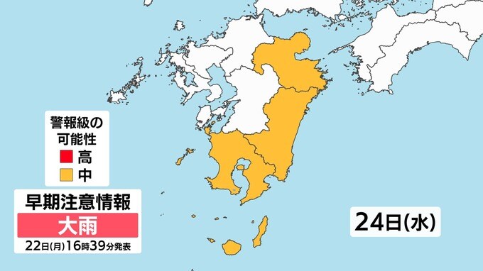 【九州 秋分の日 傘を持って】警報級の大雨のおそれ「雨はいつから どこで?」【雨・発雷確率シミュレーション23日(火祝)24日(水)/週間予報】福岡・佐賀・長崎・大分・熊本・宮崎・鹿児島 南日本放送 2025年9月22日(月) 19:30 国内 天気 【地図で確認】大雨警報・洪水警報の可能性がある地域は? 大分県・宮崎県・鹿児島県は、警報級の可能性が【中】となっているため、今後発表される防災気象情報に注意してください。地元自治体が発表する避難情報などもこまめにチェックしておきましょう。