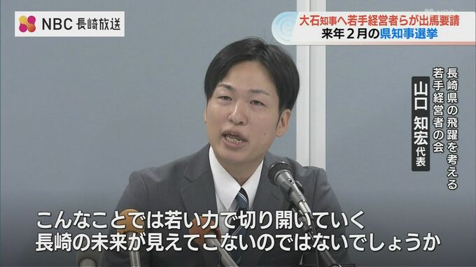 任期満了に伴う2026年2月の県知事選挙を巡り、長崎県内の若手経営者らが22日、現職の大石知事へ出馬を要請しました。
