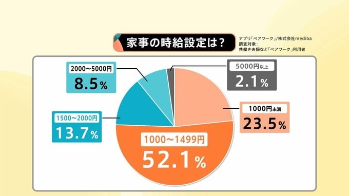 家事共有アプリ「ペアワーク」で、家事の時給設定の傾向を調べたところ、▼1000円未満が23.5%、▼1000~1499円が52.1%という結果でした。