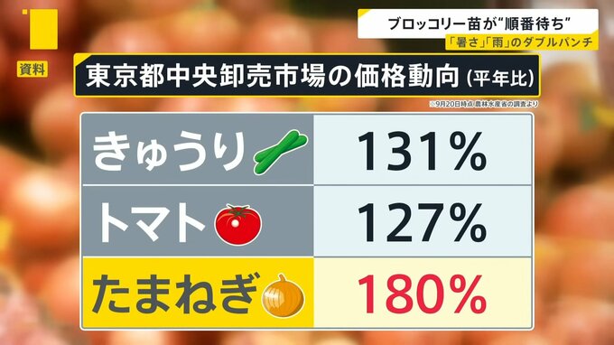 東京都の中央卸売市場の価格動向では、きゅうりやトマトが平年比で3割ほど高く、中でもたまねぎは8割高くなっています。これらは暑さや雨不足の影響だといいます。