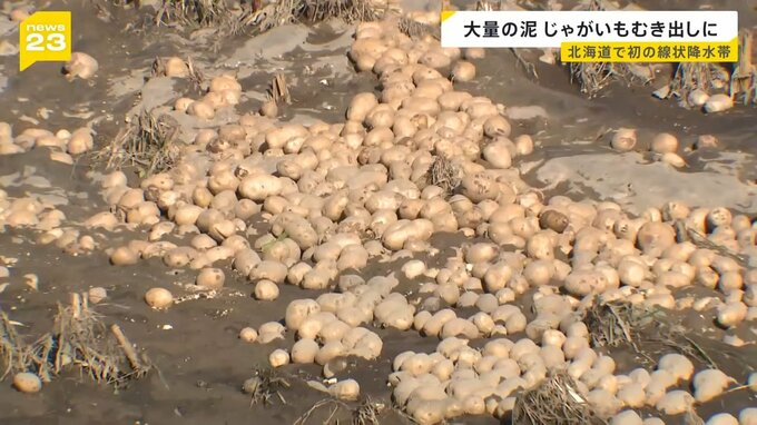 同じく、24時間降水量が観測史上1位を記録した浦幌町では、町を流れる下頃辺川の土手が大雨で決壊。近くにある畑は、出荷間近のジャガイモがむき出しになってしまっています。