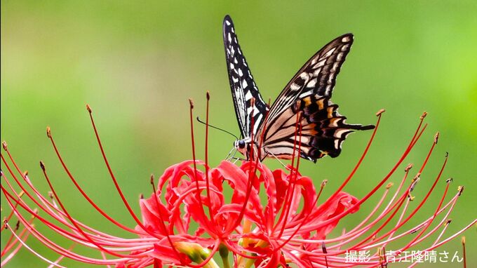 「真っ赤なヒガンバナには黒いチョウがよく似合います。写真に写っているのはクロアゲハ。アゲハチョウの仲間では大型で目立つ存在で、黒い翅が赤い花によく映えます。私は近縁種のカラスアゲハも好きで、『カラスの濡れ羽色』といわれるように、光の角度で青や緑に輝く翅はまさに宝石のよう。
