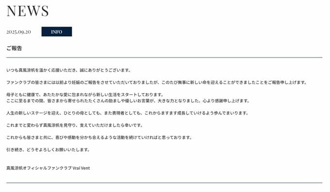 真風さんは【ご報告】と題し、「ファンクラブの皆さまには以前より妊娠のご報告をさせていただいておりましたが、このたび無事に新しい命を迎えることができましたことをご報告申し上げます」と、第1子出産を明かしました。
