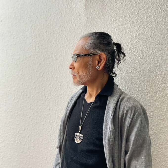 片岡さんは、メインとなるグレーの「アンティークデザインのロングシャツジャケット」に、「VERSACE(ヴェルサーチェ)」の黒いシャツを合わせています。