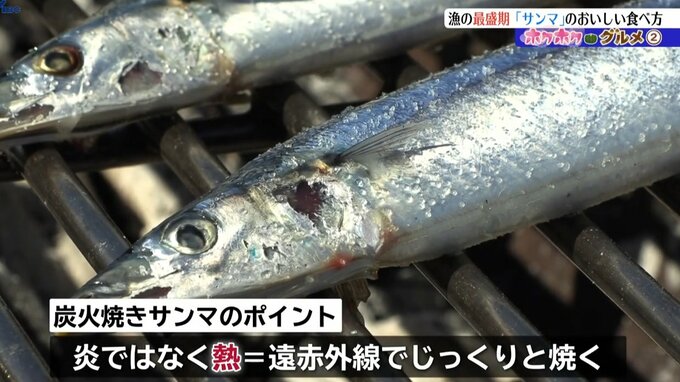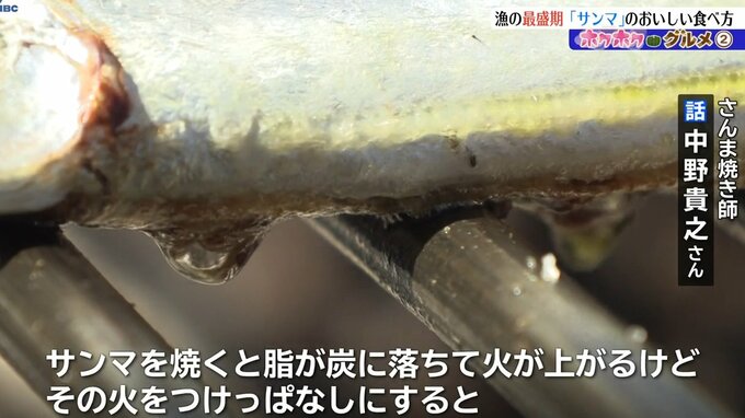 「サンマ焼いてるとサンマの脂が炭に落ちて火が上がるんですけれども、その火をつけっぱなしにしておきますとですね、サンマがただただ焦げるだけでよろしくないんでその火をこの持ってる水で消しながらその炭で起こる熱で焼いていくような感じです」