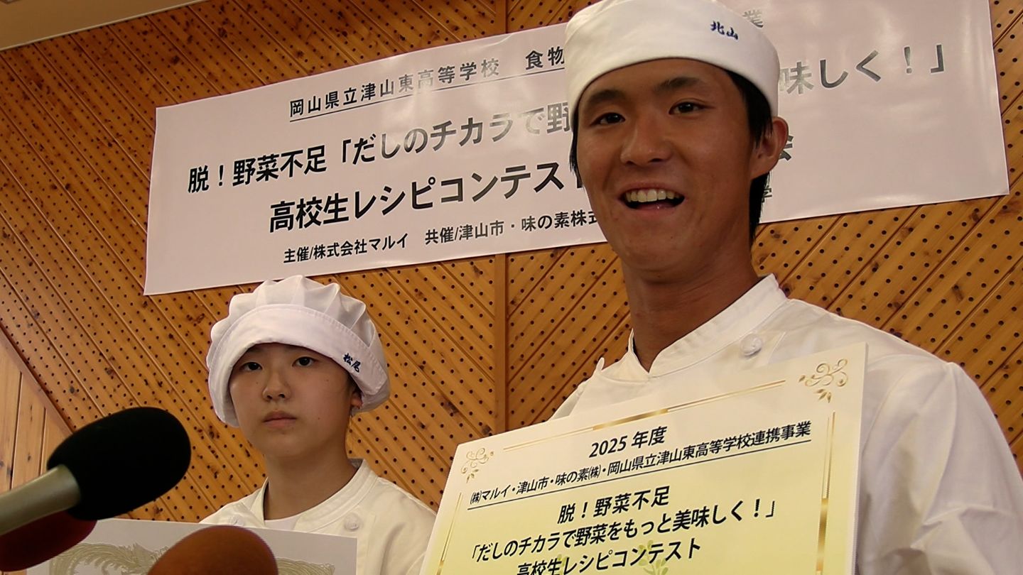 岡山県津山市の高校で野菜不足解消をテーマにしたレシピコンテストが開かれました。コンテストは、津山東高校が地産地消や食育を目的にスーパーの「マルイ」や大手食品メーカーの「味の素」などと共に毎年開催している催しです。
