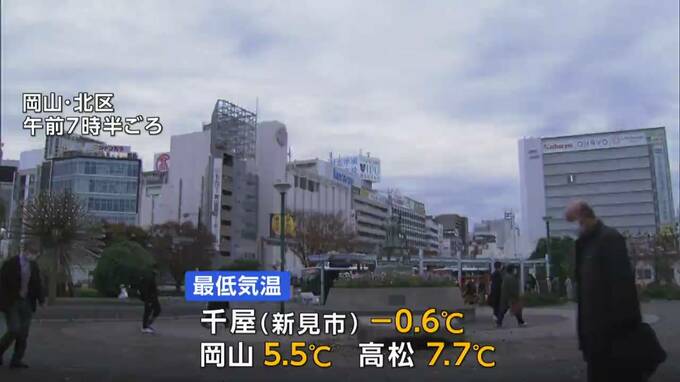 けさの最低気温は、新見市の千屋でマイナス0・6度、岡山で5・5度などを記録しました。先週から続いた温かさから一転の急な冷え込みで、岡山市中心部でも手袋やマフラーなど防寒対策をして通勤・通学する人が多く見られました。