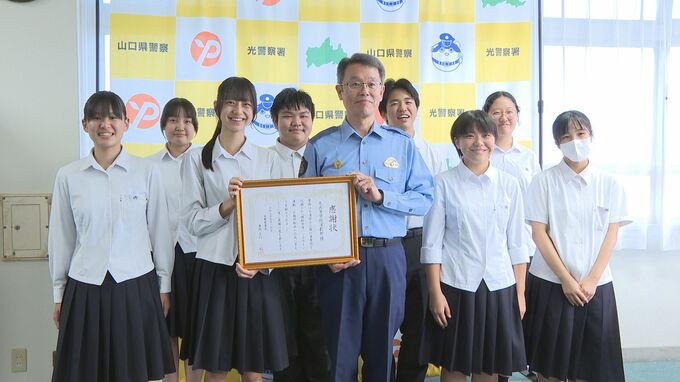 動画を作ったのは、光高校演劇部の8人です。光署の末松一也署長から感謝状が贈られました。