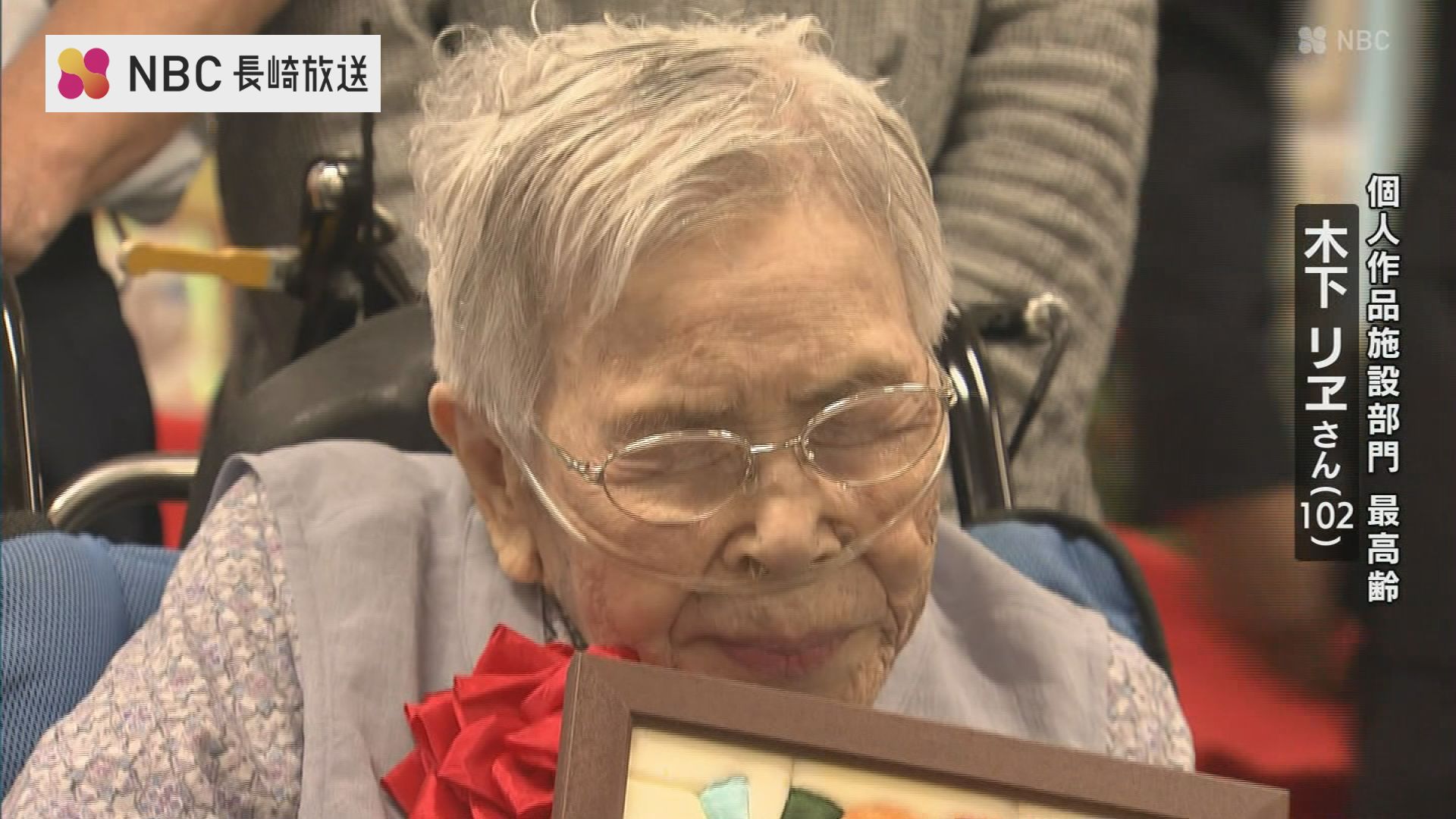 個人作品部門(施設)最高齢 木下リヱさん(102)「(制作するのは)好きやけん。苦にならん。みなさんのおかげで生き延びてるありがとう。」