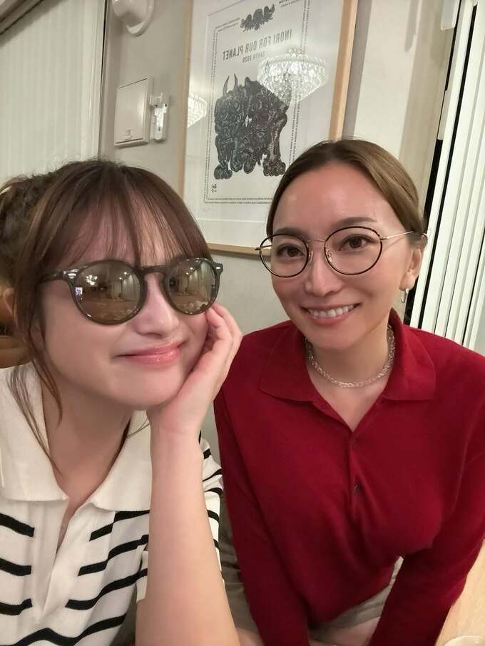 写真からは、ストライプのシャツを着てサングラスをかけた鈴木さんと、赤いトップスに眼鏡をかけた綾菜さんが、少し顔を赤らめ、笑顔でリラックスした様子がうかがえます。