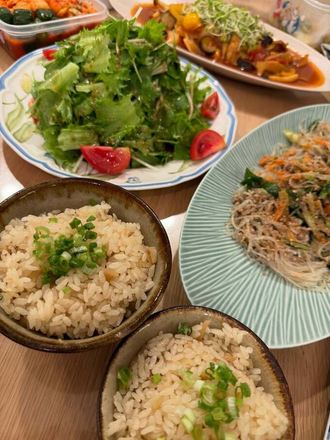 投稿には、食卓の写真も添えられており、緑のねぎがトッピングされた炊き込みご飯や、レタスとトマトが彩りを添えるサラダ、春雨料理など、バラエティ豊かな家庭料理が並んでいます。