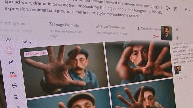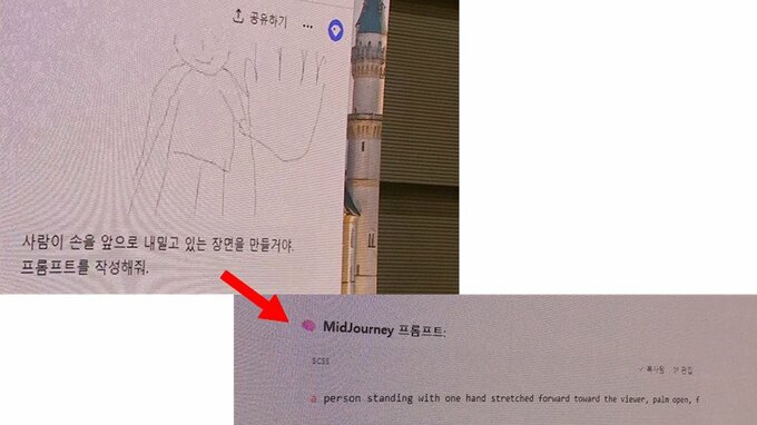 使うのは複数の生成AIモデル。まず、パソコン上でラフな絵コンテを生成AIの「ChatGPT」に読み込ませ、別の生成AI「Midjourney」に対する指示文を生成させる。