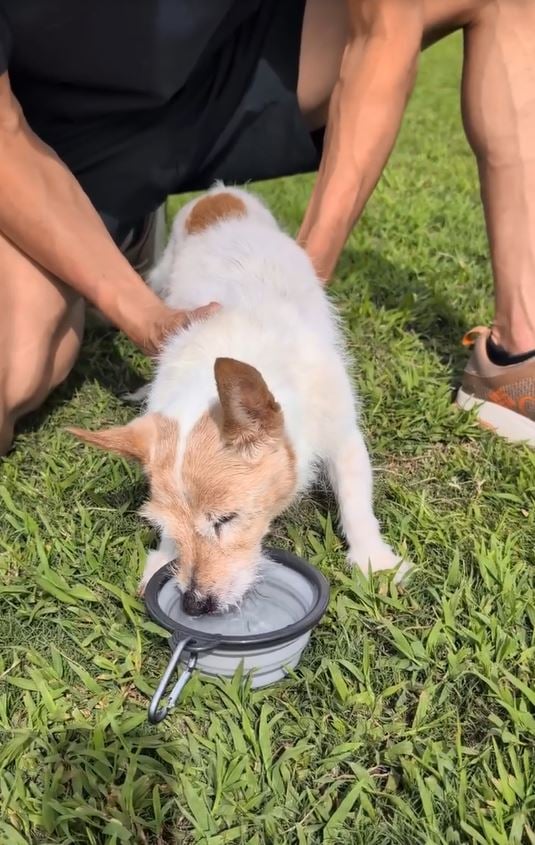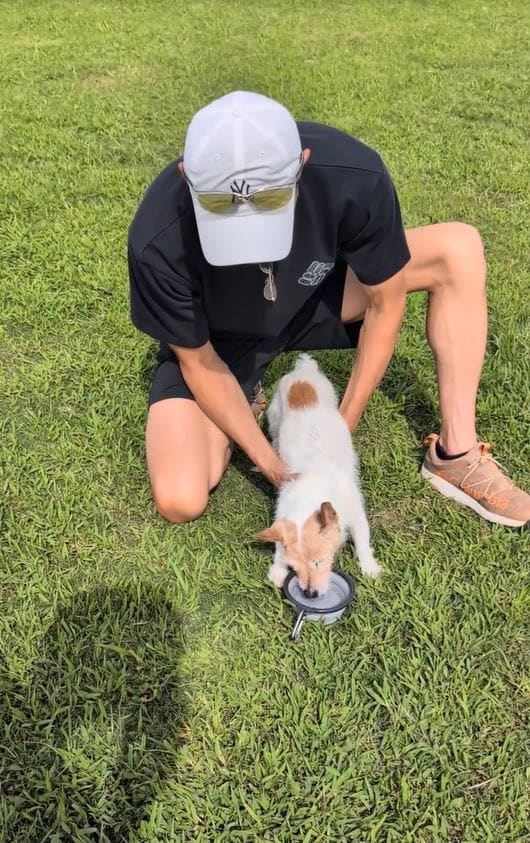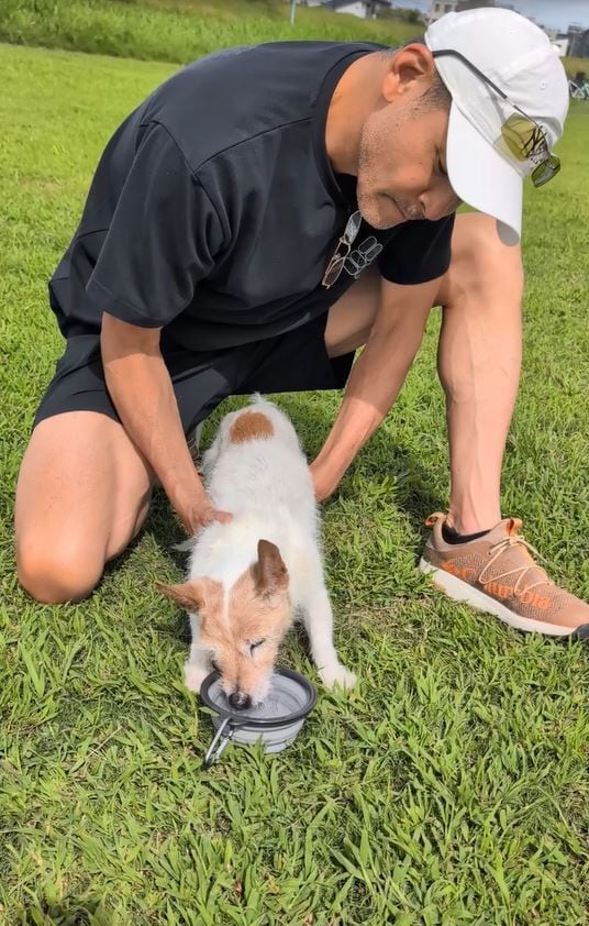 前日には、愛犬のテンを野原に連れ出し、水を飲ませる動画を投稿。