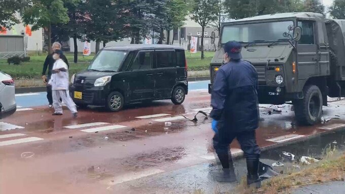 警察と消防によりますと、自衛隊の車両など車9台が絡む事故で、現場からは事故を起こしたとみられる乗用車の運転手1人が立ち去っているということです。