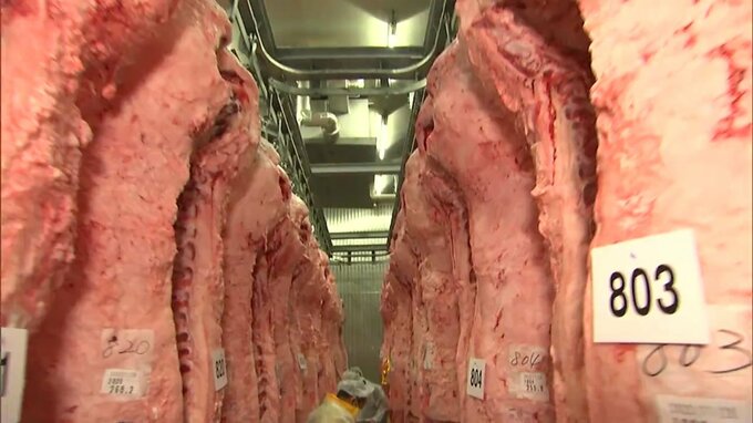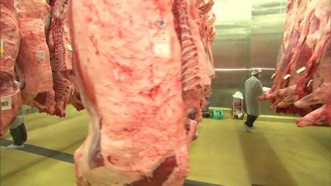 岡山県内5つの地域から集まった牛や豚、あわせて130頭の枝肉が並びました。共進会は、JA全農おかやまが品質や生産技術の向上などをめざして毎年開いています。