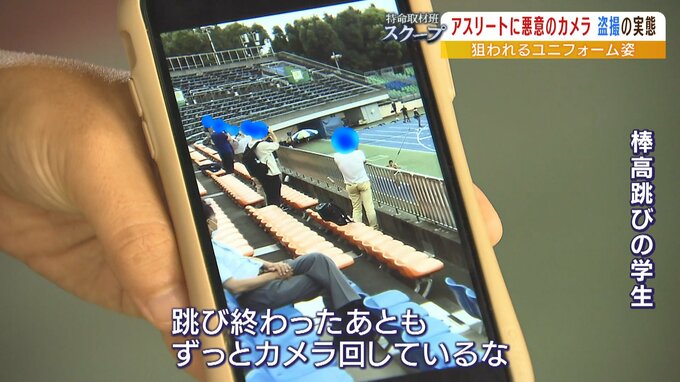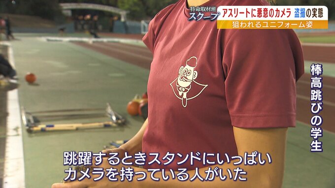 【注目】深掘り解説&特集 アスリートの性的盗撮...現役学生の証言「あ、撮られているなと」私服警察官に密着してわかる検挙の難しさ...声かけした怪しい男性の正体は? 毎日放送 2022年12月1日(木) 15:07 国内 暮らし・マネー 学生「明らかに盗撮している角度」「跳躍時にいっぱいカメラ持つ人が…」 その中でも盗撮が相次いでいるのが陸上競技。地区大会などでは観客が自由に出入りしやすく十分な警備体制が整わないのが狙われる理由だ。陸上競技を行う学生に話を聞いた。 (短距離の学生) 「試合で走り終わった後に、明らかに携帯の角度が『盗撮しているな』っていう角度があって。こういう角度で追われている感じだったので、『あ、撮られているな』となりました」 棒高跳びを行う学生は、仲間に撮影してもらった映像を見て、大勢の見知らぬ人からカメラを向けられていたことを知った。 (棒高跳びの学生) 「自分が跳躍するときにスタンドにいっぱいカメラを持っている人がいたという感じですね。跳び終わった後とかもずっとカメラを回しているなと。一眼レフもあるし携帯もある」