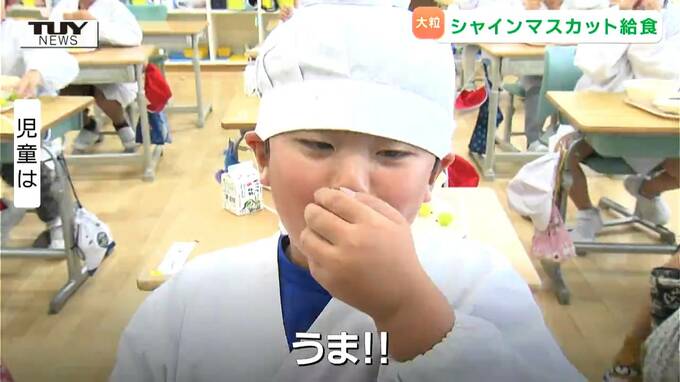 今年も市内の小中学校や保育園など20か所にシャインマスカットおよそ165キロが提供され、ここ、赤湯小学校の児童たちも生産者が大切に育てたブドウを頬張りました。