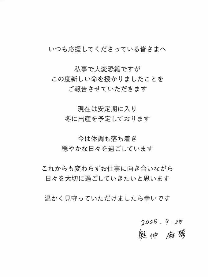 奥仲さんは、涼しくなってきた季節に合うシュタイフの羊のぬいぐるみの写真を投稿。「この度新しい命を授かりましたことをご報告させていただきます」「現在は安定期に入り 冬に出産を予定しております」と、文書の接写を続けて投稿しています。