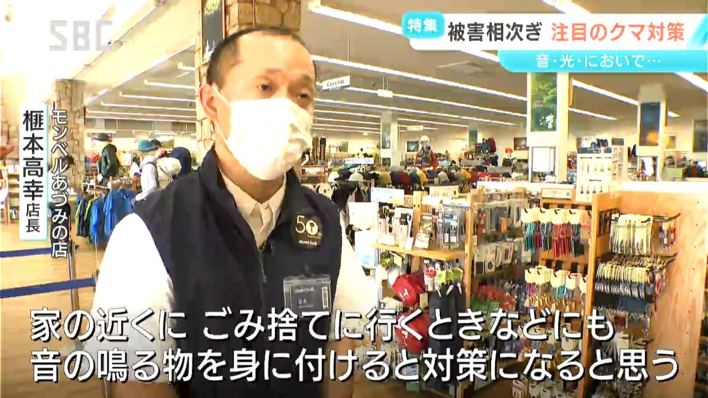 モンベル安曇野店 榧本高幸店長:「一人で山に入る人は特に音が出なくなるので、鈴や笛を使うほか、一人になって静かな時にクマと鉢合わせると危険なので、家の近くにゴミ捨てに行くときなどにも音の鳴る物を身に付けると、ある程度の対策になると思う」