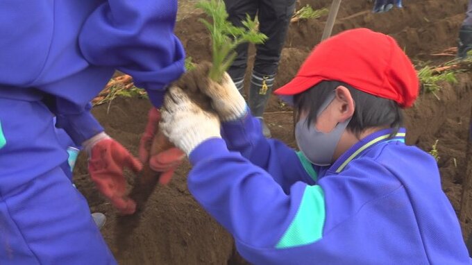 「のっぷい」と呼ばれる肥沃な土で育つ大塚ニンジンは長いもので子どもの身長と同じくらいの1m以上に育ち、子どもたちはニンジンが折れないように丁寧に掘り出していました。