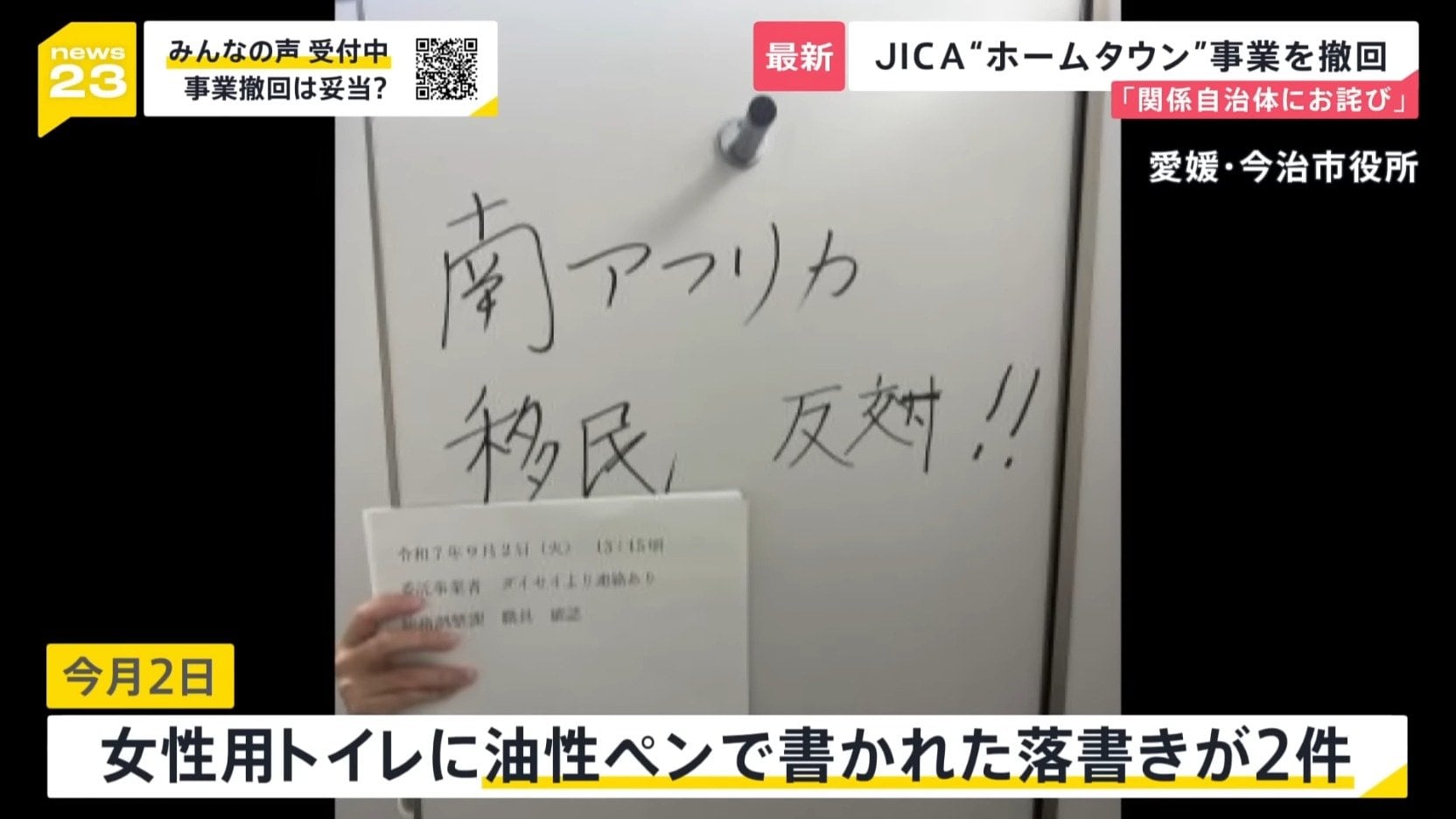 愛媛県今治市では9月2日、市役所の女性用トイレで「移民反対」などと油性ペンで書かれた落書きが2件見つかりました。