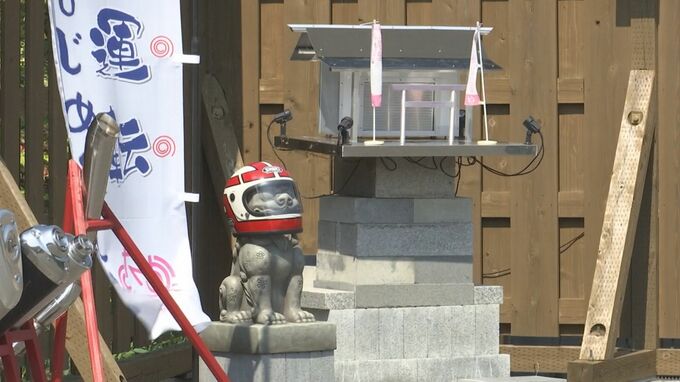 峠道をバイクで楽しむ人が多いことから、交通安全と町の賑わいを願って設けられたこの神社、狛犬は猛暑の日もこのヘルメットを被ってライダー達を見守りました。