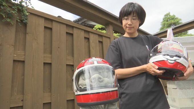狛犬と同じデザインのヘルメットを抱えているのが、地域おこし協力隊でオートバイ神社の代表の女性。