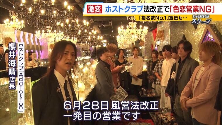 (櫻井海晴店長)「6月28日、風営法改正一発目の営業です。『別れたくないならシャンパン入れて』とか、『付き合ってるんだったらお店に来てくれ』とか、そういうことがダメということです。みんなで元気よく営業していきましょう」