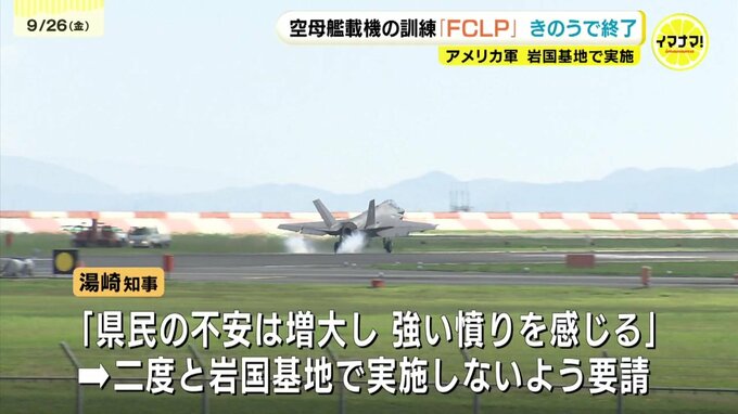 終了を受けて広島県の湯崎知事は、予定時刻を超えたり祝日に実施したりしたことで、「県民の不安は増大し、強い憤りを感じている」として、二度と岩国基地で実施しないよう、アメリカ軍や日本政府などに文書で要請しました。