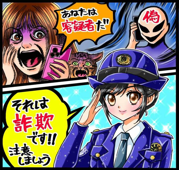 翔子さんは、楳図かずおさんの怪奇マンガを彷彿とさせる自画像と愛猫が「あなたは容疑者だ」という偽電話を聞いて叫ぶ表情を描き、その下に女性警察官が敬礼しながら「それは詐欺です!!注意しましょう」と呼びかけている、2コママンガの形をとった分かりやすい注意喚起のイラストを投稿。