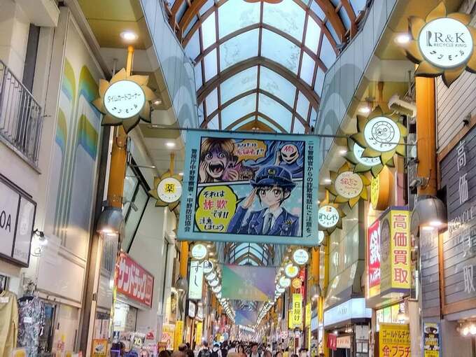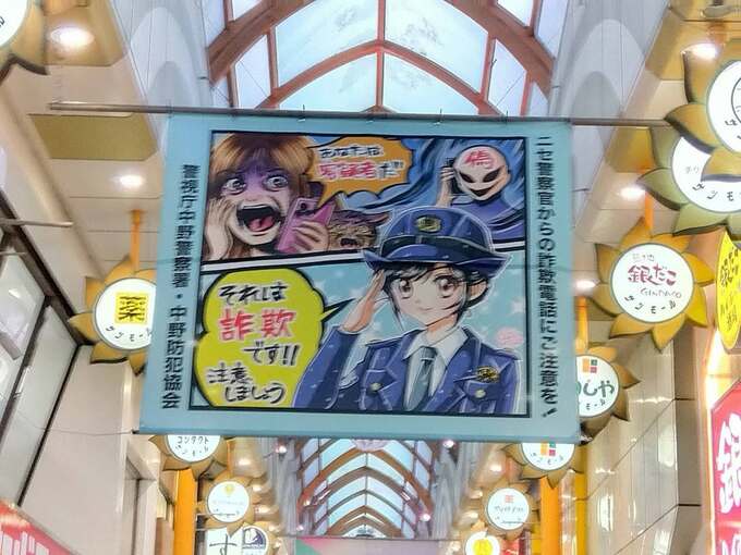 ついで翔子さんが投稿した写真は、中野サンモールの巨大なアーケードに、そのイラストがタペストリーとなって吊され、商店街をゆく大勢の方々の頭上から詐欺防止を呼びかける様子となっています。