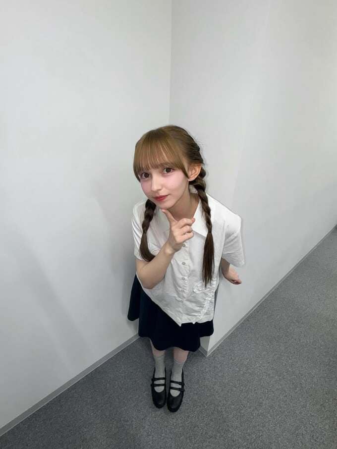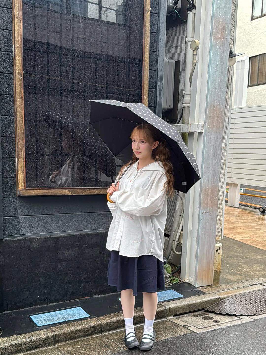 雨の日のコーディネートも公開されており、黒いドット柄の傘を差し、白いシャツと濃い色のスカートを組み合わせたスタイルは、しっとりとした雰囲気を醸し出しています。一連の投稿で履いている黒の靴を指して「オニツカの靴これ履き心地良すぎてめっちゃ使ってる」と締めくくっています。