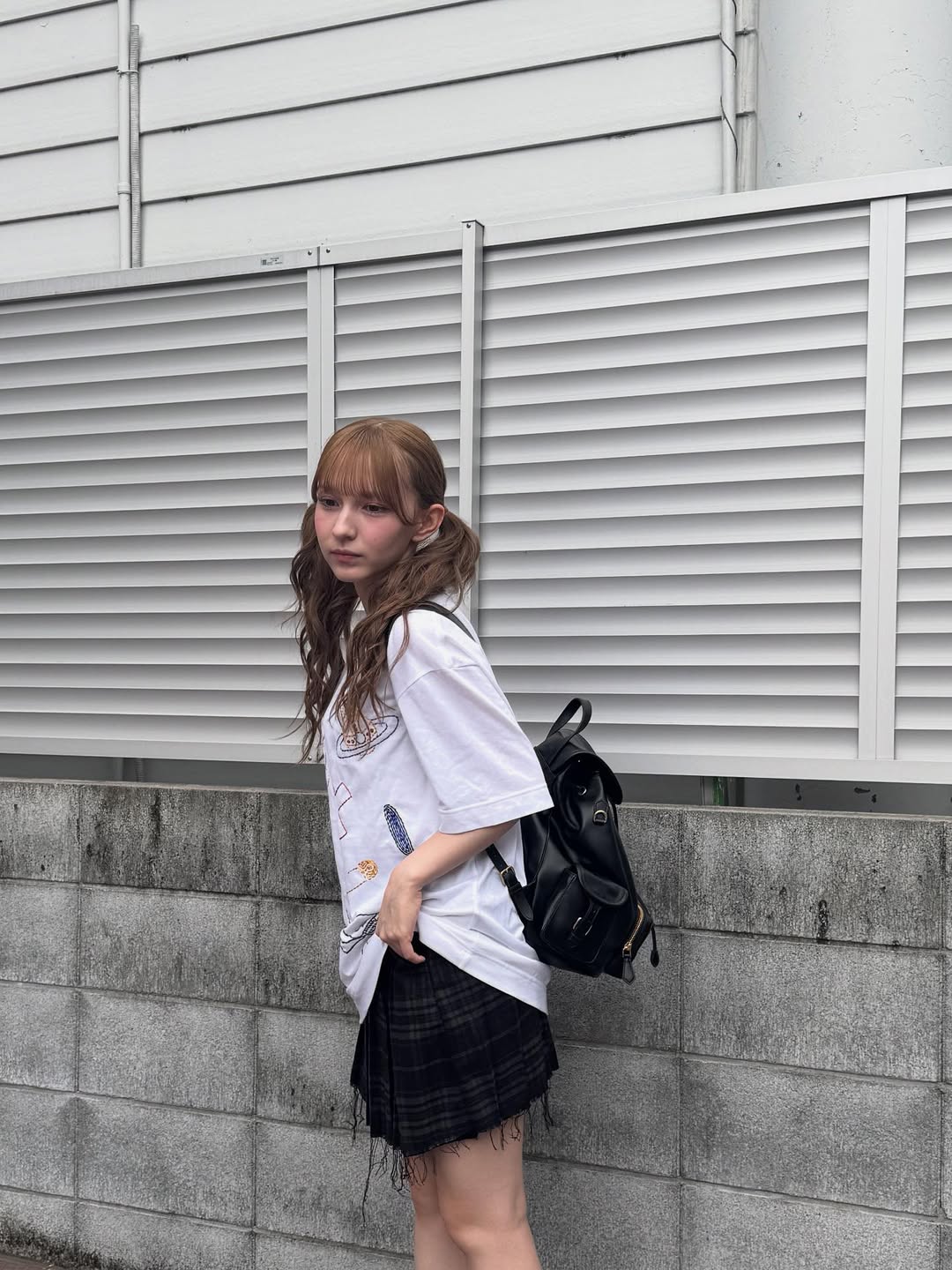 白いシャツにスカート黒いミニスカートは、さわやかな制服風のスタイル。