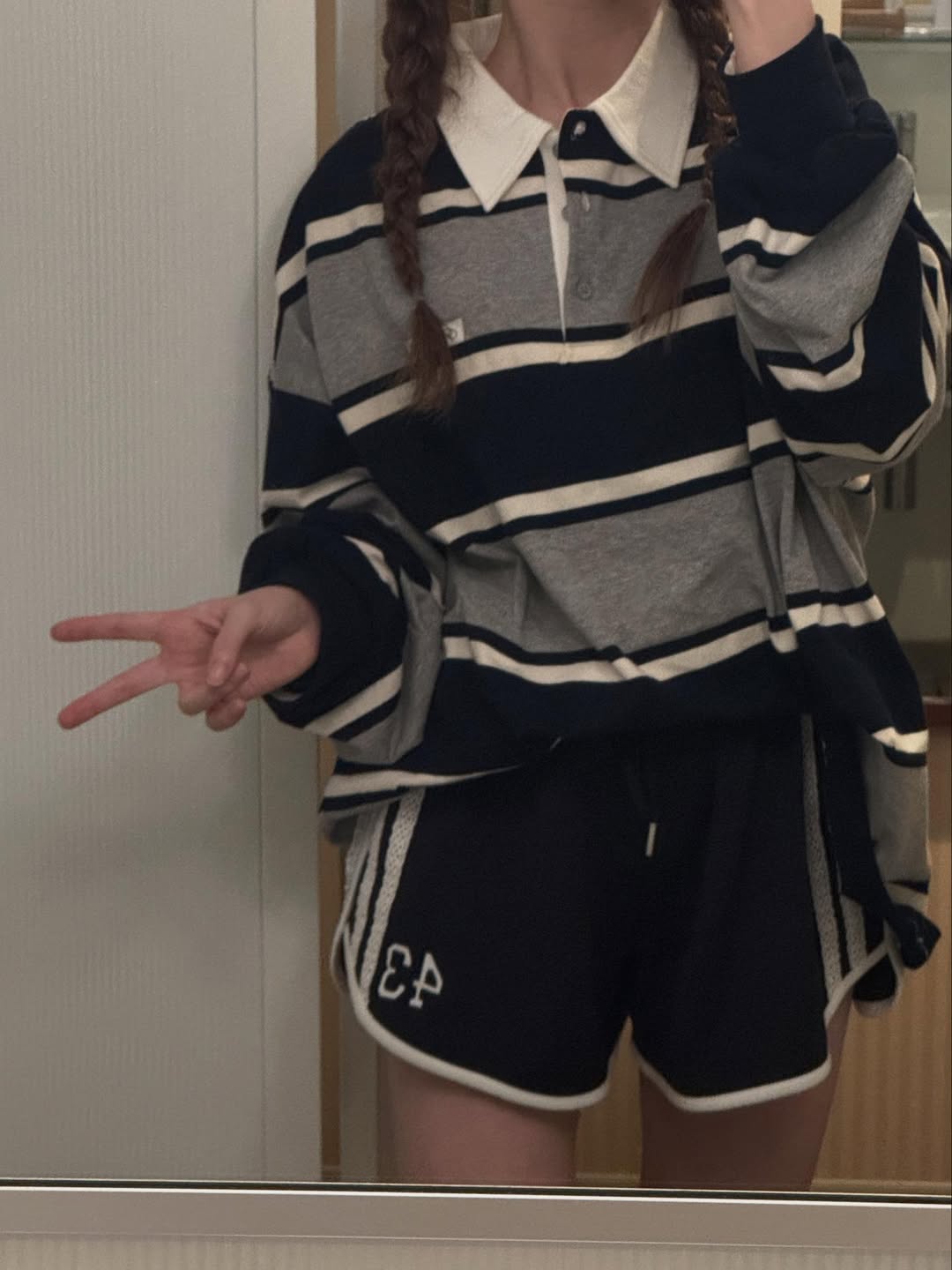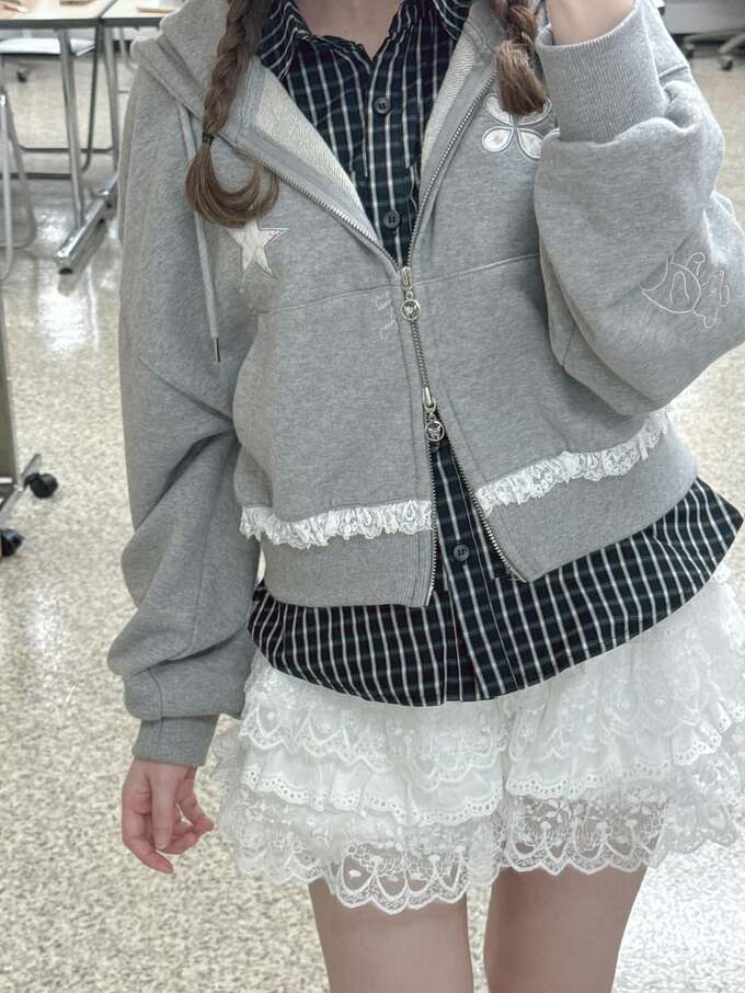 一方で、レースがあしらわれたグレーのパーカーとチェックのシャツに、フリルのスカートを組み合わせたカジュアルな装いもあり、バラエティ豊かなスタイルが見られます。