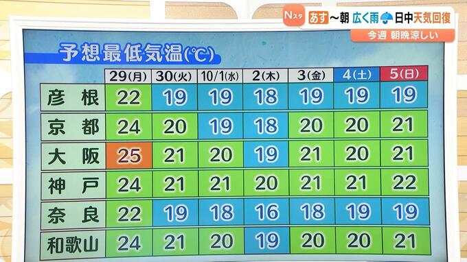 9月29日(月)の近畿地方は風がさわやか。昼間は日ざしの暑さを感じられますが、朝晩は過ごしやすくなりそうです。 28日(日)夜から29日(月)朝にかけて、日本海を進む低気圧からのびる前線が近畿地方を…
