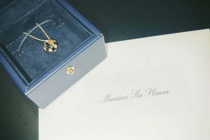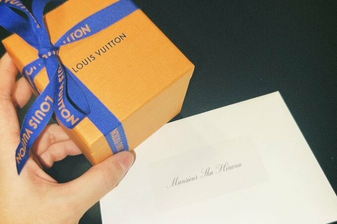 投稿に添えられた「Monsieur Sho Hirano」フランス語でムッシュ平野紫耀と書かれた封筒も目を引きます。青いリボンがかかったオレンジ色のルイ・ヴィトンの箱と一緒に写っています。