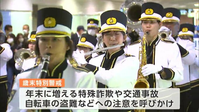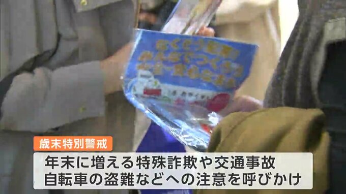 人やお金の動きが多くなる年の瀬には特殊詐欺や交通事故、それに自転車の盗難などが多くなることから、参加者は地下街を歩きながらチラシなどを配り通行人に警戒を呼びかけていました。