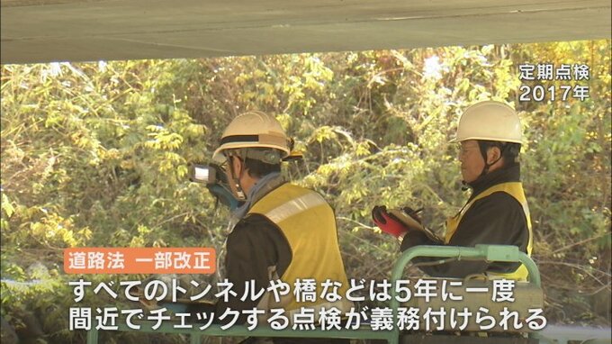 笹子トンネルの事故が契機になって、道路法の一部が改正され全てのトンネルや橋などは5年に1度、間近でチェックする点検が義務付けられました。