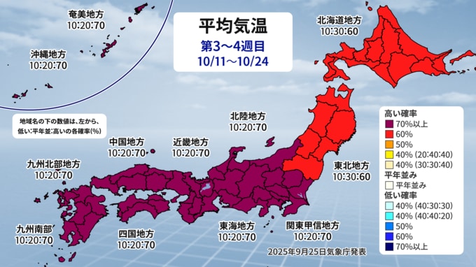 10月に入っても、秋の深まりはゆっくりです。気象庁が発表した最新の1か月予報では、10月も全国的に高温傾向が続き、特に上旬は平年よりも「かなり気温が高い」見込みです。