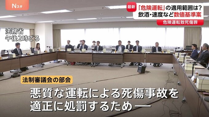 危険運転致死傷罪の見直しに向けた議論を進めている法制審議会で、法務省は議論のたたき台となる数値基準の条文案を示しました。法務大臣の諮問機関「法制審議会」の部会では、悪質な運転による死傷事故を適正に処…