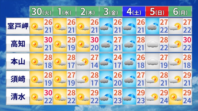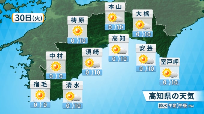30日の高知県内は、高気圧に覆われて概ね晴れるでしょう。一日を通してすっきりとした秋晴れとなりそうです。