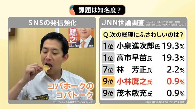 9月に行ったJNN世論調査で、「次の総理にふさわしいのは?」と聞いたところ、小林氏は9位という結果でした。