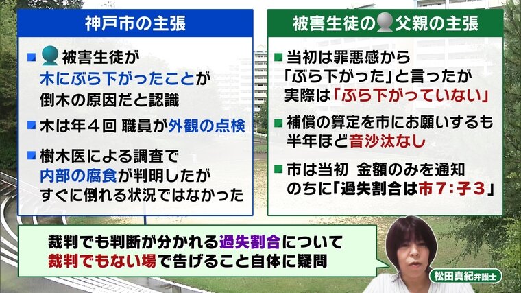 ▼当初は“自分のせいで木が倒れたのでは”という罪悪感から生徒は「ぶら下がった」と言ったが、実際は「ぶら下がっていない」