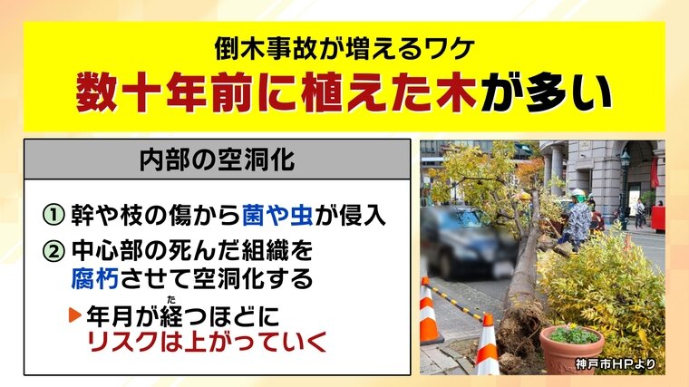 2つ目の理由は「近年の激しい気候変動」。猛暑や突然の雨、台風の時期の変化などで、木の弱まりがより早まっているそう。