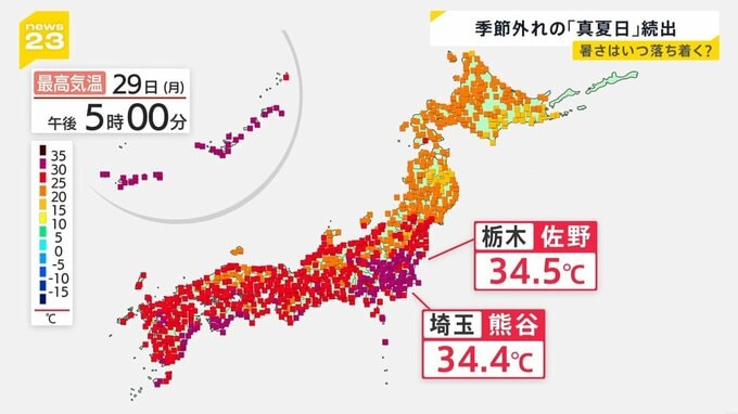 9月ももう終わり。しかし29日は、関東を中心に真夏日が続出。栃木県佐野市は34.5℃、埼玉県熊谷市34.4℃と猛暑日に迫る気温となりました。東京都心でも30.9℃を観測。