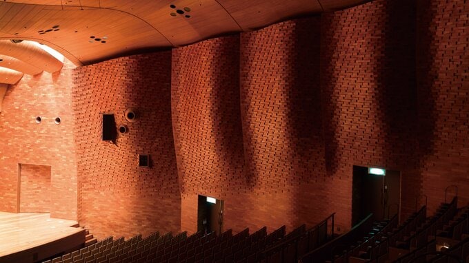 一般的な音楽ホールと比べて勾配のあるFFGホールは、広さと高さのバランスが絶妙で、音が均一に拡散されるという特長を持つ。ステージの音は赤松のブロック壁や曲線の天井に広がり柔らかく変化し、観客の耳に心地よく伝わっていく。