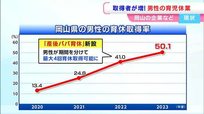 育児休業を取得する男性は、ここ数年、岡山県内でも急増しています。