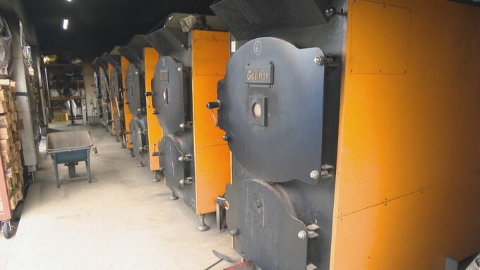 36度の源泉の温度管理に使用しているのが、屋外に設置された6台のボイラーです。以前は重油式でしたが2022年に約1億円を投じ、薪ボイラーに更新しました。