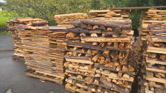 燃料となる薪は、愛媛県内の各地から集めています。松山市内の解体業者からは建築廃材を、林業の盛んな久万高原町の生産者からは山の健康を保つため切り出したスギやヒノキの間伐材を、また、松野町の森林整備会社から薪を、それぞれ取り寄せています。年間使用量は、約1400トンに上るといいます。